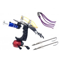 Рогатка с упором для руки, с магазиом для шариков и с прицелом. Также есть возможность регулировки упора и рогов с резинкой.